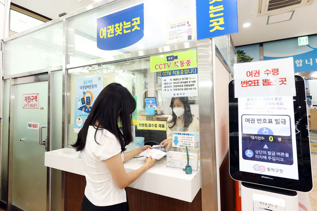 동작구 민원실에서 민원인이 여권과 여권 케이스를 교부 받고 있는 모습